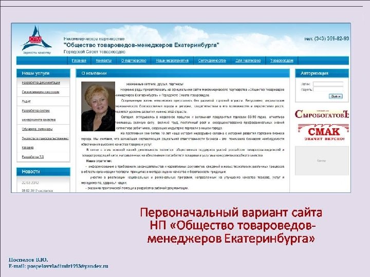 О Партнерстве Год создания: октябрь 2005 года Юридический адрес: г. Екатеринбург, ул. Бородина, д. 26, телефон 258 10 38 Адрес исполнительной дирекции: г. Екатеринбург, ул. 8 Марта, 8 Б, оф. 227 а e-mail: np-tovaroved@mail. ru тел. 359 -82 -93 сайт: еkb-kaсhestvo. ru
