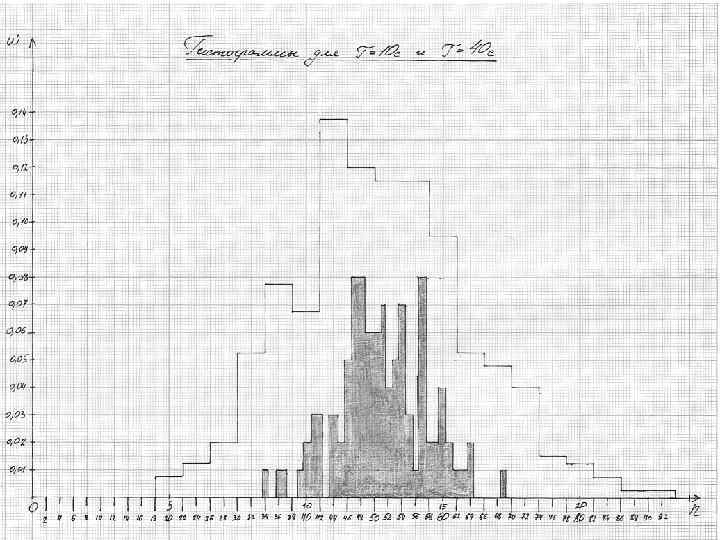 4. Представим результаты последнего распределения в виде, удобном для построения гистограммы (таблица 4). Гистограммы распределений среднего числа отсчетов за 10 и 40 с строим на одном графике. При этом для второго распределения цену деления по оси абсцисс увеличиваем в 4 раза, чтобы положения максимумов распределений совпадали.