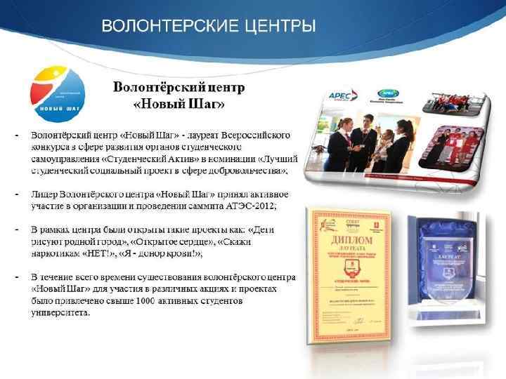 ВОЛОНТЕРСКИЕ ЦЕНТРЫ Председатель комитета студенческого самоуправления В. Редько участвовал во Всероссийском студенческом форуме «Реализация-2012» в Алтайском крае. Он представил свой проект «Волонтёрский Центр "Новый шаг"» В. Редько также работал волонтером на саммите АТЭС в сентябре 2012 г. во Владивостоке. В декабре 2012 г. в Перми в рамках Всероссийского форума В. Редько вошёл в число победителей конкурса «Доброволец России – 2012» Отряд факультета педагогики, социальной работы и физической культуры «Эмпатия» - мастер-класс «Информационная модель построения профилактической антинаркотической работы» ; санация территории прилегающей к учебным корпусам, работы в «Семейном фитнесклубе «На Коновалова»