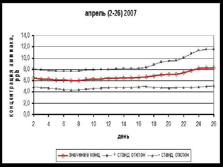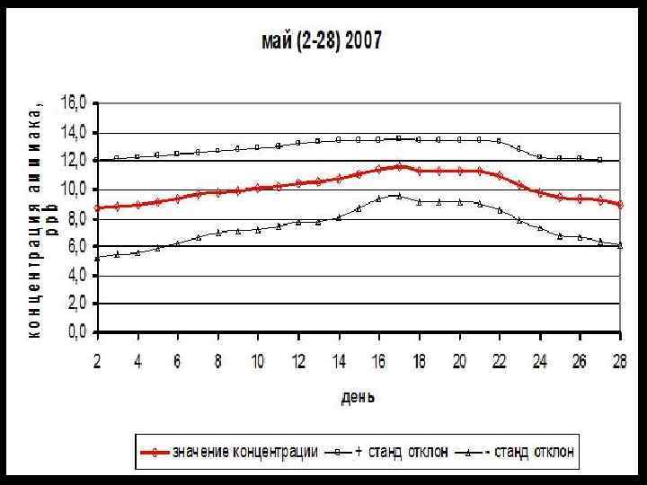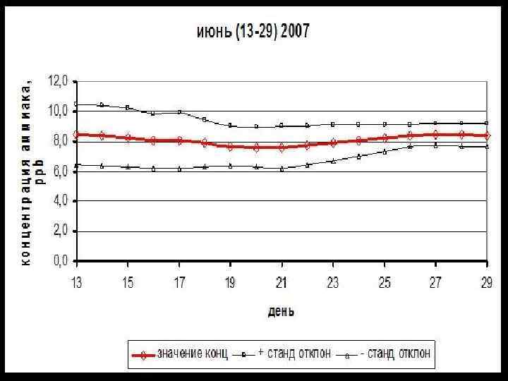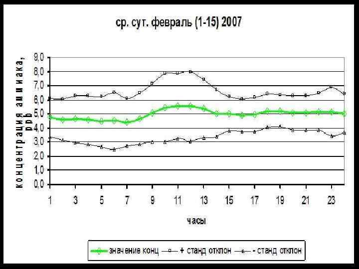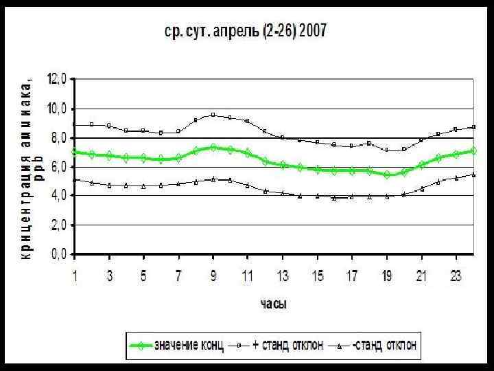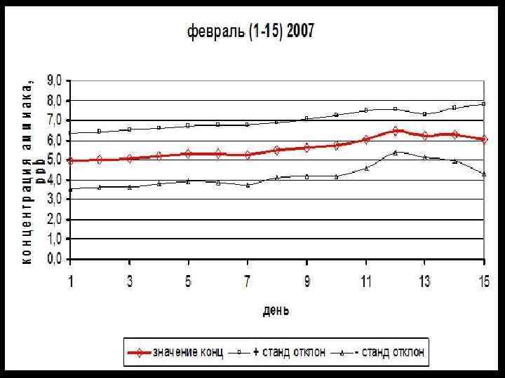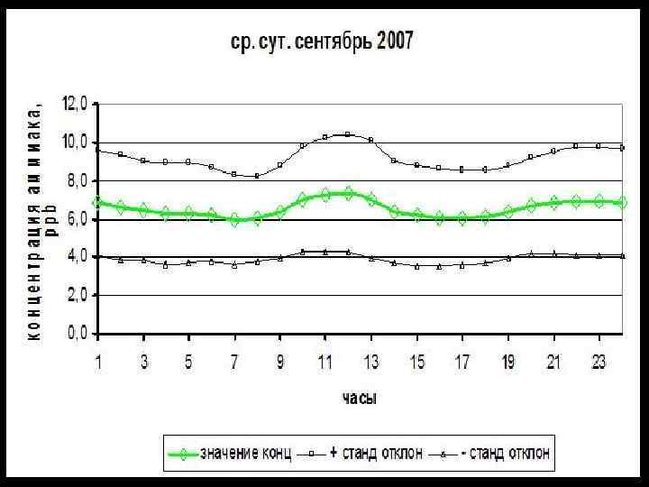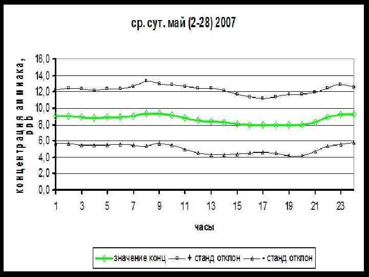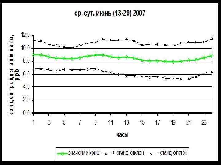 На данной стадии работа включает в себя обработку данных с учетом только временного параметра и представляет следующие результаты: ШХод концентрации аммиака в течение года ШСезонный ход концентраций ШСуточный ход концентраций Обработаны данные за период с января по сентябрь 2007 года
