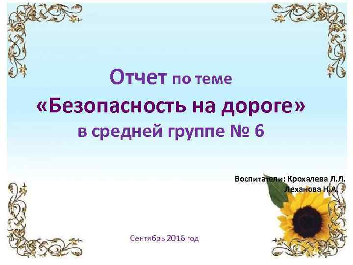 Отчет по теме «Безопасность на дороге» в средней группе № 6 Воспитатели: Крохалева Л. Л. Леханова Н. А. Сентябрь 2016 год