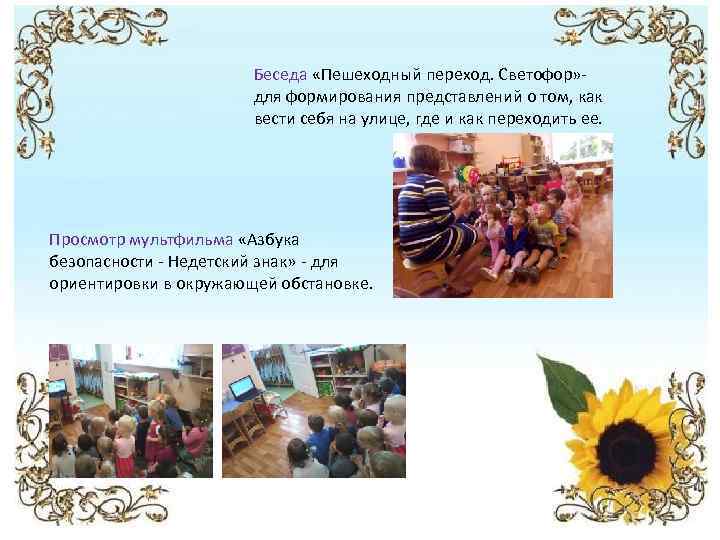 Беседа «Пешеходный переход. Светофор» - для формирования представлений о том, как вести себя на улице, где и как переходить ее. Просмотр мультфильма «Азбука безопасности - Недетский знак» - для ориентировки в окружающей обстановке.