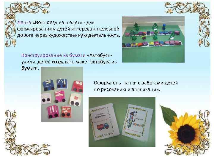 Лепка «Вот поезд наш едет» - для формирования у детей интереса к железной дороге через художественную деятельность. Конструирование из бумаги «Автобус» - учили детей создавать макет автобуса из бумаги. Оформлены папки с работами детей по рисованию и аппликации.