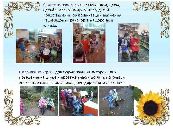 Сюжетно-ролевая игра: «Мы едем, едем!» - для формирования у детей представлений об организации движения пешеходов и транспорта на дорогах и улицах. Подвижные игры – для формирования осторожного поведения на улице и проезжей части дороги, используя элементарные правила поведения дорожного движения.