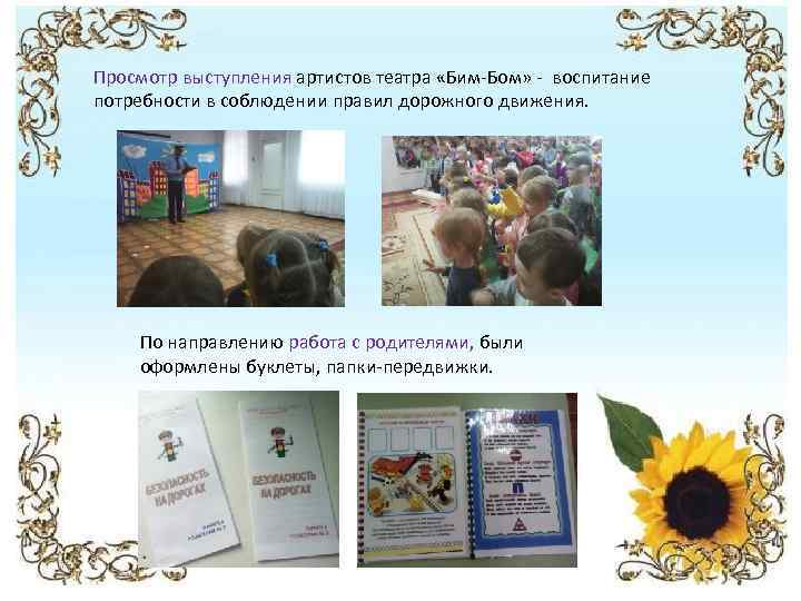 Просмотр выступления артистов театра «Бим-Бом» - воспитание потребности в соблюдении правил дорожного движения. По направлению работа с родителями, были оформлены буклеты, папки-передвижки.
