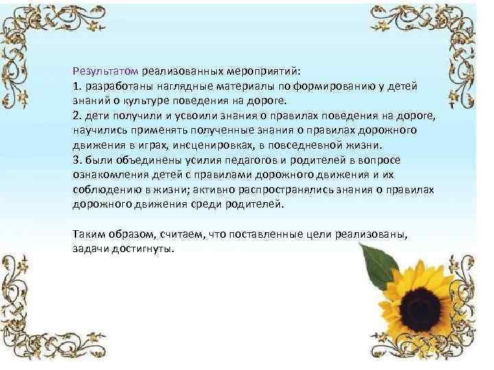 Результатом реализованных мероприятий: 1. разработаны наглядные материалы по формированию у детей знаний о культуре поведения на дороге. 2. дети получили и усвоили знания о правилах поведения на дороге, научились применять полученные знания о правилах дорожного движения в играх, инсценировках, в повседневной жизни. 3. были объединены усилия педагогов и родителей в вопросе ознакомления детей с правилами дорожного движения и их соблюдению в жизни; активно распространялись знания о правилах дорожного движения среди родителей. Таким образом, считаем, что поставленные цели реализованы, задачи достигнуты.
