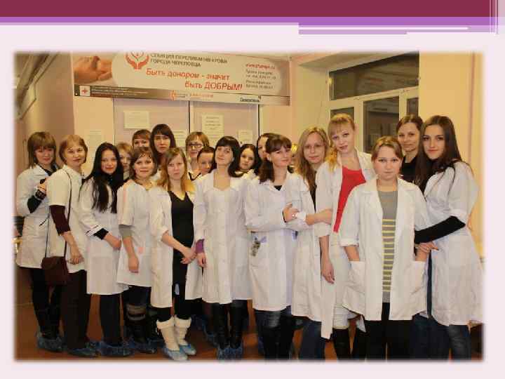 Цели: • Посещение станции переливание крови с целью ознакомления с методикой сбора крови, её дальнейшей обработкой. • Рассмотрение станции переливания крови, как возможного дальнейшего места работы. • Привлечение студентов для донорства.