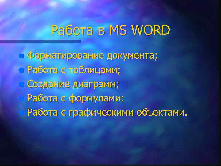 Работа в MS WORD Форматирование документа; n Работа с таблицами; n Создание диаграмм; n Работа с формулами; n Работа с графическими объектами. n