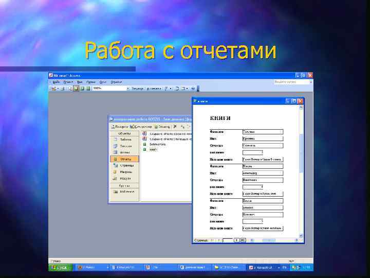Работа в СУБД MS Acctss Создание запросов n Работа с отчетами n Создание межтабличных связей n Работа с базой данных n