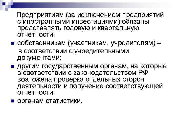 Предприятиям (за исключением предприятий с иностранными инвестициями) обязаны представлять годовую и квартальную отчетности: n собственникам (участникам, учредителям) – в соответствии с учредительными документами; n другим государственным органам, на которые в соответствии с законодательством РФ возложена проверка отдельных сторон деятельности и получение соответствующей отчетности; n органам статистики.
