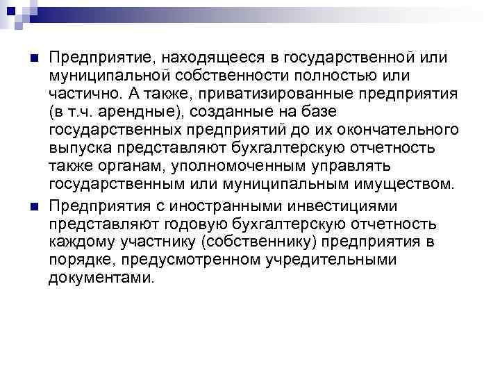 n n Предприятие, находящееся в государственной или муниципальной собственности полностью или частично. А также, приватизированные предприятия (в т. ч. арендные), созданные на базе государственных предприятий до их окончательного выпуска представляют бухгалтерскую отчетность также органам, уполномоченным управлять государственным или муниципальным имуществом. Предприятия с иностранными инвестициями представляют годовую бухгалтерскую отчетность каждому участнику (собственнику) предприятия в порядке, предусмотренном учредительными документами.