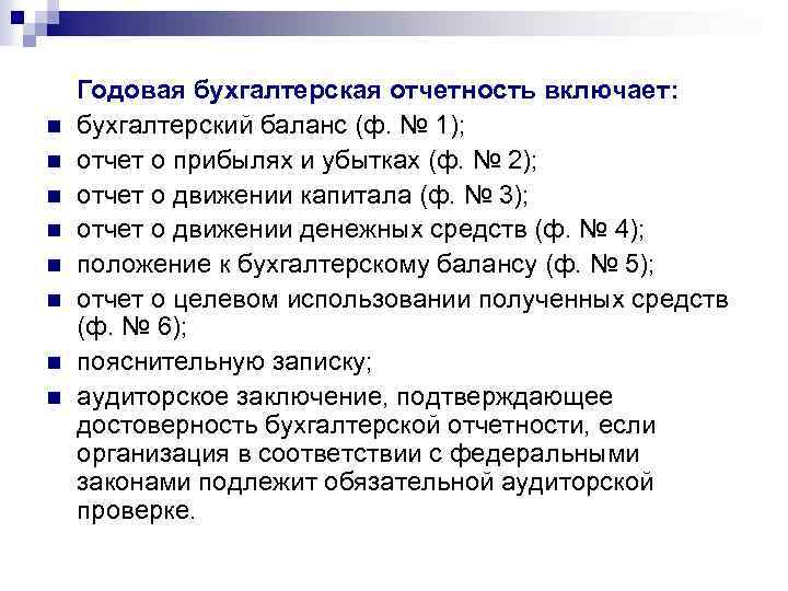 n n n n Годовая бухгалтерская отчетность включает: бухгалтерский баланс (ф. № 1); отчет о прибылях и убытках (ф. № 2); отчет о движении капитала (ф. № 3); отчет о движении денежных средств (ф. № 4); положение к бухгалтерскому балансу (ф. № 5); отчет о целевом использовании полученных средств (ф. № 6); пояснительную записку; аудиторское заключение, подтверждающее достоверность бухгалтерской отчетности, если организация в соответствии с федеральными законами подлежит обязательной аудиторской проверке.