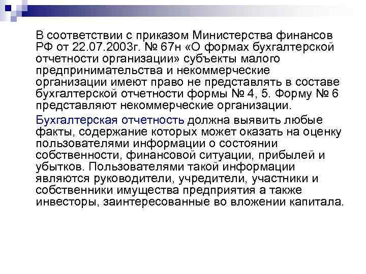 В соответствии с приказом Министерства финансов РФ от 22. 07. 2003 г. № 67 н «О формах бухгалтерской отчетности организации» субъекты малого предпринимательства и некоммерческие организации имеют право не представлять в составе бухгалтерской отчетности формы № 4, 5. Форму № 6 представляют некоммерческие организации. Бухгалтерская отчетность должна выявить любые факты, содержание которых может оказать на оценку пользователями информации о состоянии собственности, финансовой ситуации, прибылей и убытков. Пользователями такой информации являются руководители, учредители, участники и собственники имущества предприятия а также инвесторы, заинтересованные во вложении капитала.