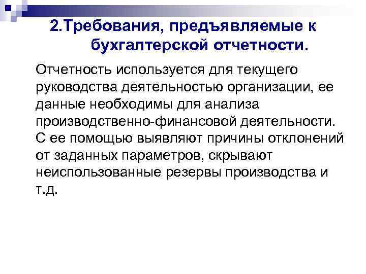 2. Требования, предъявляемые к бухгалтерской отчетности. Отчетность используется для текущего руководства деятельностью организации, ее данные необходимы для анализа производственно-финансовой деятельности. С ее помощью выявляют причины отклонений от заданных параметров, скрывают неиспользованные резервы производства и т. д.