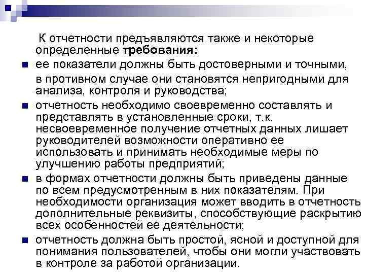 n n К отчетности предъявляются также и некоторые определенные требования: ее показатели должны быть достоверными и точными, в противном случае они становятся непригодными для анализа, контроля и руководства; отчетность необходимо своевременно составлять и представлять в установленные сроки, т. к. несвоевременное получение отчетных данных лишает руководителей возможности оперативно ее использовать и принимать необходимые меры по улучшению работы предприятий; в формах отчетности должны быть приведены данные по всем предусмотренным в них показателям. При необходимости организация может вводить в отчетность дополнительные реквизиты, способствующие раскрытию всех особенностей ее деятельности; отчетность должна быть простой, ясной и доступной для понимания пользователей, чтобы они могли участвовать в контроле за работой организации.