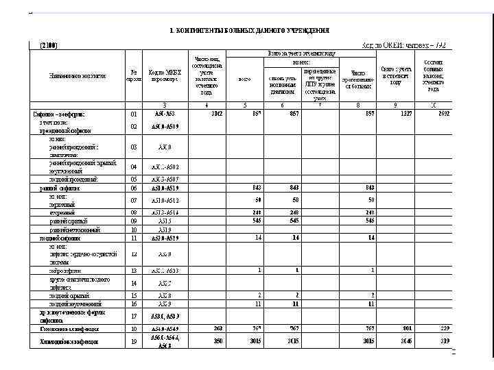Форма № 9 «Сведения о заболеваниях инфекциями, передаваемыми половым путем и заразными кожными болезнями» Включаются сведения о числе вновь зарегистрированных случаев заболеваний инфекциями, передаваемыми половым путем (сифилитическая инфекция, гонококковая инфекция, трихомоноз, хламидийные инфекции, вирусные инфекции, передаваемые половым путем: урогенитальный герпес, аногенитальные (венерические) бородавки) и заразными кожными болезнями (дерматофитии и чесотка). Включены сведения о детях и путях их инфицирования сифилитической инфекцией; числе больных инфекциями, передаваемыми половым путем, сочетанных с ВИЧ-инфекцией. Кроме того в Форме отражаются сведения о контингенте больных сифилисом, зарегистрированных в УФСИН; распределении больных по месту фактического проживания и социальным группам.
