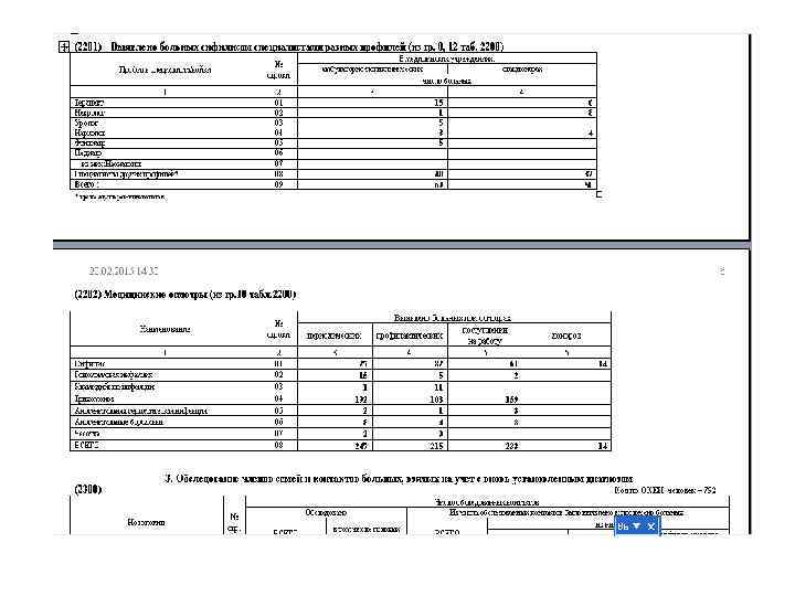 Сведения о пациентах, госпитализированных в наркологические и психиатрические стационары, показываются в разделе III: о числе госпитализированных пациентов, больных наркологическими расстройствами, в том числе госпитализированных впервые в данном году и впервые в жизни, сельских жителях, пациентов в возрасте 0 -14 и 15 -17 лет; в отдельных графах показываются выбывшие пациенты (в том числе в связи со смертью) и сведения о продолжительности их пребывания в стационаре, а также об оставшихся в стационаре на конец отчетного года. В отдельных строках предоставляются сведения о женщинах с наркологическими расстройствами и пациентах, употребляющих наркотики инъекционным способом, а также об обследованных лицах и признанных психически здоровыми. В отдельных таблицах раздела предоставляются сведения об обследовании пациентов наркологического профиля на ВИЧ и другие гемоконтактные инфекции (гепатиты B и C), а также результаты такого обследования; данные о госпитализированных по направлениям амбулаторных наркологических (психиатрических) организаций и иных каналах поступления, переведенных из психиатрических и наркологических стационаров, включенных в стационарные реабилитационные программы, а также лечившихся на платной основе. В разделе IV показываются данные о деятельности дневных стационаров для наркологических пациентов; в разделе V – о наркологическом освидетельствовании лиц для определения состояния алкогольного опьянения, а также факта употребления и (или) опьянения наркотическими и иными ПАВ; в разделе VI – данные о врачебно-наркологической экспертизе; в разделе VII – сведения о реабилитационных наркологических центрах и реабилитационных наркологических отделениях, организованных в рамках наркологических и психиатрических организаций.
