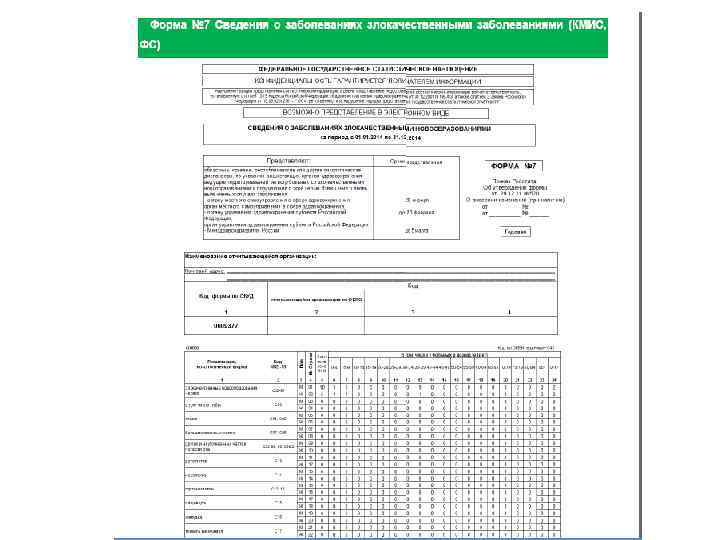 Форма № 7 "Сведения о заболеваниях злокачественными новообразованиями" заполняется на основании: первичной учетной документации (ф. № 090/У) «Извещение о больном с впервые в жизни установленным диагнозом злокачественного новообразования» Включаются сведения о впервые в жизни выявленных злокачественных новообразованиях в отчетном году независимо от обстоятельств выявления: 1. при обращении за медицинской помощью; 2. профилактических осмотрах; 3. диспансеризации отдельных контингентов населения и хронических больных, при реализации скрининговых программ; 4. медицинское освидетельствование; при обследовании и лечении в стационаре МУ, в частности, при диагностике злокачественного новообразования … При выявлении у больного нескольких опухолей, каждое новообразование включается как отдельный первично-множественный случай, независимо от того возникли они синхронно (в течение 6 месяцев) или метахронно (последовательно через 6 и более месяцев). Распределены: по локализациям (согласно МКБ-10), полу и возрасту (5 -летние возрастные группы от 0 до 85 лет и старше, а также возрастная группа 0 -17 лет). Из общего числа впервые в жизни выявленных злокачественных новообразований у мужчин и женщин выделяются сельские жители и число первичномножественных опухолей, выявленных у больных, состоящих на учете на конец отчетного года независимо от времени взятия на учет. В Форму включается число впервые выявленных случаев преинвазивного рака (начальная стадия рака, выявляется случайно).