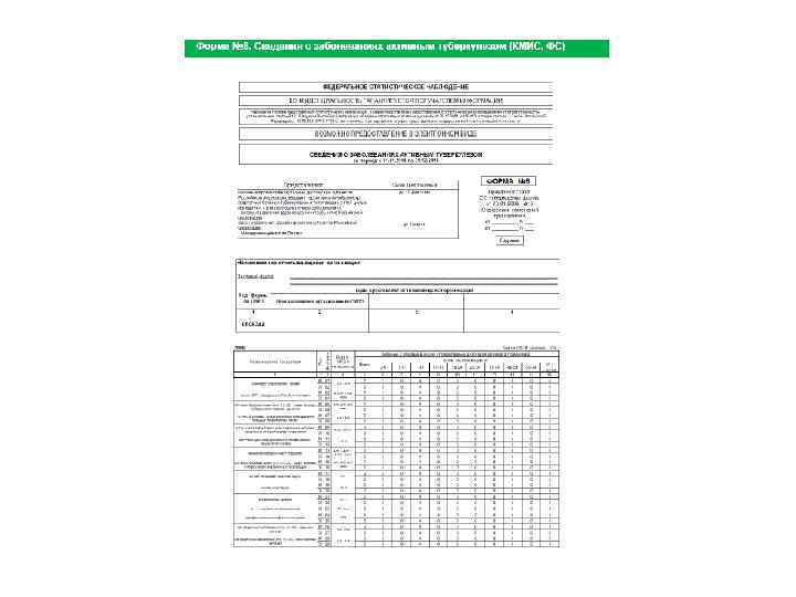 Форма № 8 «Сведения о заболеваниях активным туберкулезом» заполняется по «Извещению о больном с впервые в жизни установленном диагнозе туберкулеза; с рецидивом туберкулеза» (учетная форма № 089/у-туб. ). Извещение в обязательном порядке заполняется на больного с уточненным случаем впервые выявленного заболевания активного туберкулеза или рецидива. Извещение составляется на больного по месту выявления активного туберкулеза независимо от его места жительства, наличия и места регистрации, времени пребывания в данной местности, в том числе на мигрантов, вынужденных переселенцев, лиц без определенного места жительства, включая страны СНГ и прочих категорий. Извещение заполняется и в случаях посмертной диагностики активного туберкулеза. При выявлении больных, выделяющих микобактерии туберкулеза, кроме Извещения, заполняется «Экстренное извещение об инфекционном заболевании» (учетная форма № 058/у), которое в течение 24 часов пересылается в отделение Роспотребнадзора по месту фактического жительства больного для проведения необходимых противоэпидемических мероприятий. Перед составлением отчета рекомендуется произвести алфавитизацию всех Извещений и сверку их с алфавитной картотекой предыдущих лет или компьютерной базой данных с целью выявления и изъятия возможных дубликатов.
