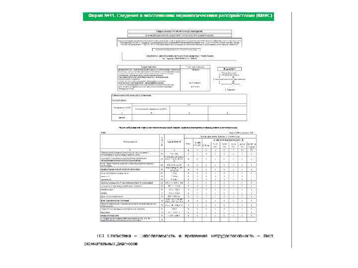 Форма № 11 «Сведения о заболеваниях наркологическими расстройствами» (далее - Форма) заполняется на основании сведений, содержащихся в первичной учетной медицинской документации. Основным источником информации ф. № 030 -1/02 «Карта обратившегося за психиатрической (наркологической) помощью» , а также форма № 025/у-04 «Медицинская карта амбулаторного больного» или форма № 025/у-05 -88 «Медицинская карта амбулаторного наркологического больного» . Включаются сведения обо всех зарегистрированных пациентах с наркологическими расстройствами, обратившихся в амбулаторные организации к психиатру-наркологу или психиатру. Из общего числа зарегистрированных пациентов, выделяются лица, со следующими расстройствами: синдром зависимости от алкоголя (алкоголизм), включая расстройства психотического уровня, связанные с употреблением алкоголя; синдром зависимости от наркотиков (наркомания), включая расстройства психотического уровня, связанные с употреблением наркотиков итд. Из общего числа зарегистрированных пациентов, в отдельных графах выделяются женщины, сельские жители, а также лица в возрасте 0 -14 лет, 15 -17 лет, 18 -19 лет, 20 -39 лет, 40 -59 лет и 60 лет и старше. Из общего числа пациентов с наркологическими расстройствами в отдельных строках предоставляются сведения о лицах, употребляющих наркотики инъекционным способом, а в отдельной таблице – сведения об обследовании этой категории пациентов на ВИЧ и другие гемоконтактные инфекции (гепатиты B и C), а также результаты такого обследования. Из общего числа зарегистрированных пациентов, выделяются лица, обратившиеся с указанными выше диагнозами впервые в жизни в тех же гендерных, возрастных и иных группировках.
