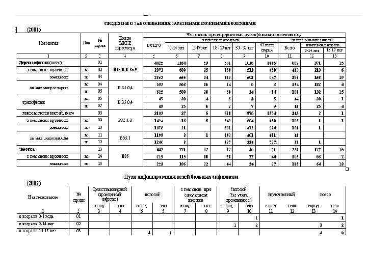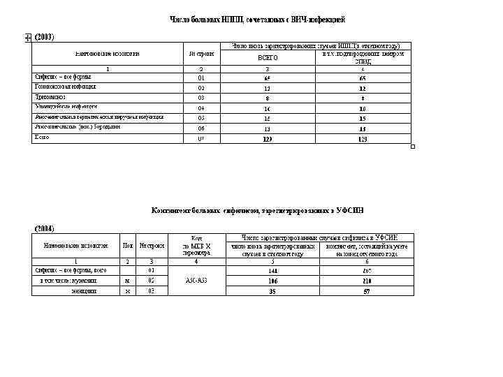 ПРОДОЛЖЕНИЕ • Таблица 2004: указывается контингент больных сифилисом, зарегистрированных в УФСИН. Данные этой таблицы не должны учитываться при составлении таблицы 2000 • Таблицы 2005 и 2006: данные в таблицах (графы 8 и 10 соответственно) должны строго соответствовать числу вновь зарегистрированных случаев (таблица 2000, графа 5)