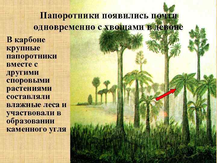Папоротники появились почти одновременно с хвощами в девоне В карбоне крупные папоротники вместе с другими споровыми растениями составляли влажные леса и участвовали в образовании каменного угля