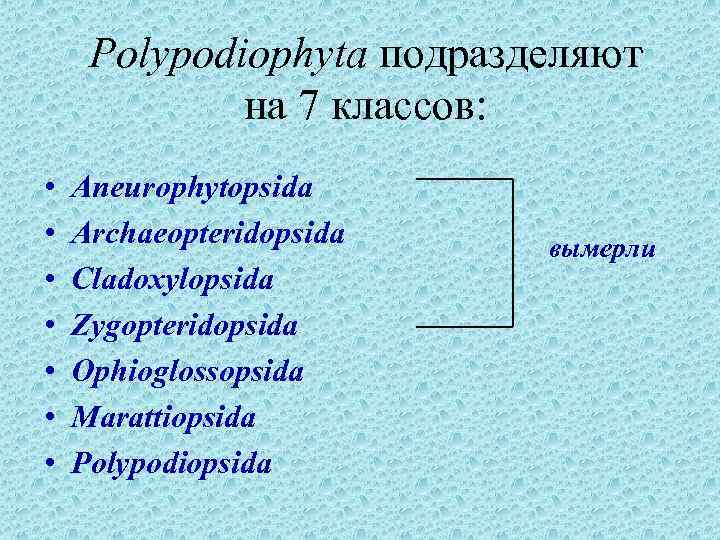 Polypodiophyta подразделяют на 7 классов: • • Aneurophytopsida Archaeopteridopsida Cladoxylopsida Zygopteridopsida Ophioglossopsida Marattiopsida Polypodiopsida вымерли