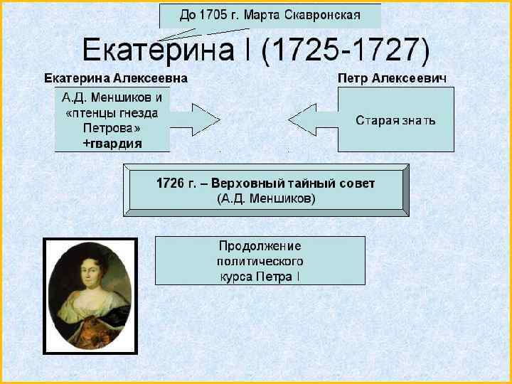 1725 - 1727 гг. правление Екатерины IНастоящее имя Марта Скавронская, прозвище «Ливонская пленница» , вторая жена Петра I. Вступила на престол при поддержке А. Д. Меншикова и гвардии.