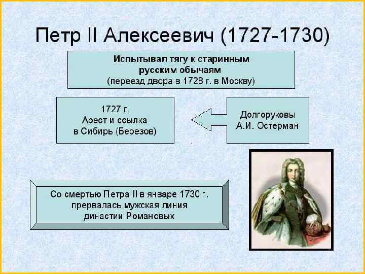 1727 -1730 гг. - правление Петра II. Внук Петра I, сын царевича Алексея. Вступил на престол в 12 лет по завещанию Екатерины. Находился под влиянием А. Д. Меншикова, с дочерью которого Марией был обручен. В результате переворота, организованного князьями Долгорукими и А. И. Остерманом, А. Д. Меншиков был сослан в Березово. Невестой Петра II была объявлена сестра Долгоруких Екатерина. В разгар подготовки свадьбы Пётр II простудился на охоте и умер. Со смертью Петра II пресеклась мужская линия династии Романовых.