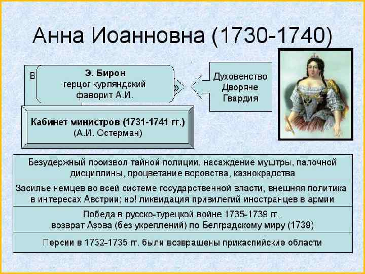 1730 -1740 гг. – правление Анны Иоанновны. Племянница Петра I, вышедшая замуж за герцога Курляндского, прозвище «Кровавая» , «Митавская затворница» .