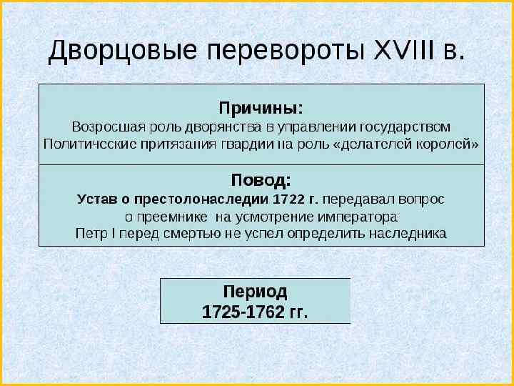 После смерти Петра I традиционный порядок наследования по прямой мужской линии вступил в противоречие с принципами, заявленными «уставом о престолонаследии» 1722 г. В результате сложился династический кризис, разрешённый путём первого дворцового переворота. Тем же противоречием будут вызваны и остальные дворцовые перевороты. В результате реформ Петра Великого дворянство стало единственным политически активным сословием. Дворцовые перевороты и предшествовавшие им заговоры подготавливались и осуществлялись дворянами. Дворяне составляли партии, дворяне плели интриги, дворяне были офицерами гвардейских полков и составляли большую часть самих гвардейцев.