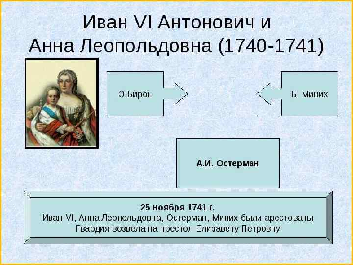Анна Иоанновна умерла, назначив преемником сына своей племянницы Анны Леопольдовны, герцогини Брауншвейгской, младенца Ивана Антоновича при регентстве Бирона. Племянник Анны Иоанновны. Вступил на престол по завещанию Анны Иоанновны в двухмесячном возрасте при регентстве Эрнста Бирона. В результате переворота, организованного Андреем Остерманом и Христофором Минихом, Эрнст Бирон был свергнут. Регентом при Иване VI стала его мать Анна Леопольдовна. Был свергнут Елизаветой Петровной в результате дворцового переворота.