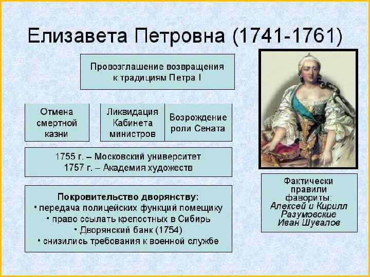 1741 -1761 гг. правление Елизаветы Петровны. Дочь Петра I, вступила на престол в результате устроенного гвардией переворота. Не замужем, среди фаворитов Алексей Разумовский, Иван Шувалов и др.