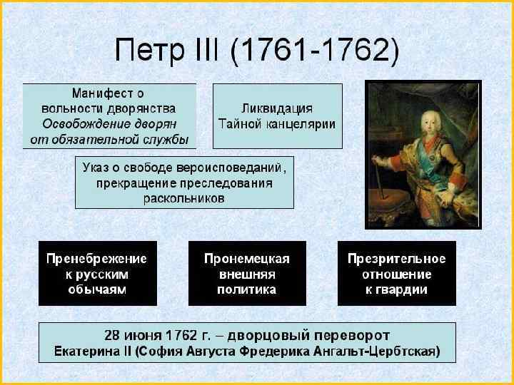 1761 -1762 гг. – правление Петра III. Племянник Елизаветы Петровны, внук Петра I и Карла XII, родом из Голштинии, енат на немецкой принцессе Софье-Августе. Фредерике Ангальт. Цербстской. Вступил на престол по завещанию Елизаветы Петровны.