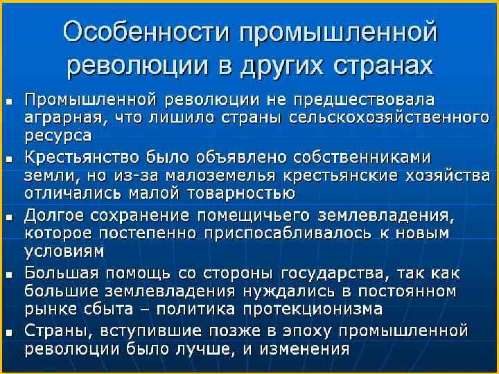Особенности промышленно го переворота в России: • совершен в более короткие сроки, чем в странах Западной Европы (Англия затратила около 100 лет, Франция 70 лет), так как Россия заимствовала у Запада технику, оборудование, идеи; • • осуществлен на основе государственных источников накопления за счет использования крепостнического труда. Частные предприниматели получали ресурсы также за счет крепостного труда.
