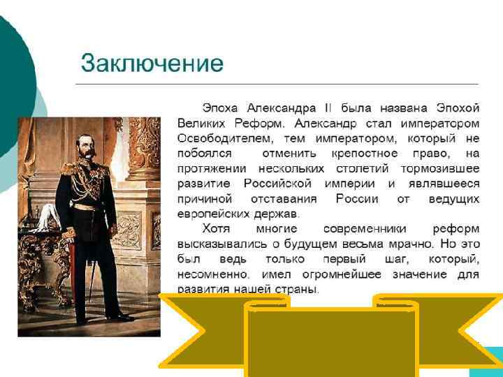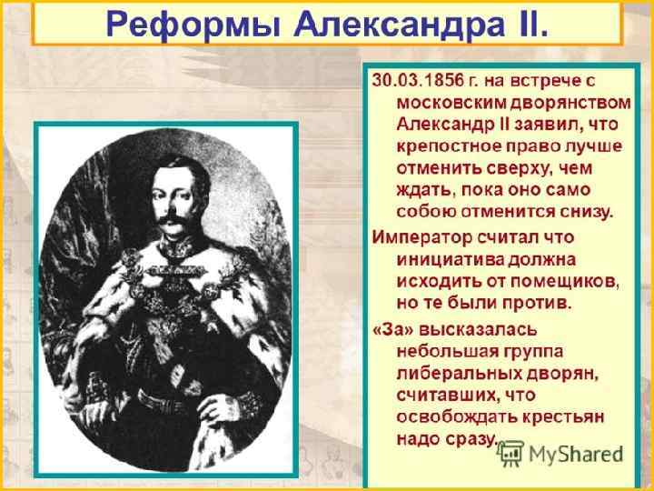 Поражение России в Крымской войне обозначили необходимость реформ во всех областях жизни и преодоления отставания от Запада. Вокруг императора Александра II сложился круг лиц, которые были готовы к проведению этих реформ. Во многом этот круг лиц сформировался в годы правления Александра I и в кружках 30– 40 х годов. Реформы Александра II позволили сохранить Россию как великую мировую державу. Вступив на престол, Александр II во многом смягчил полицейский режим Николая I: разрешен свободный выезд дворян за границу, смягчена цензура, амнистированы декабристы и петрашевцы, уничтожены военные поселения. Важнейшей реформой Александра II стала отмена крепостного права 19 февраля 1861 года. Проведение реформы первоначально подготавливалось в глубокой тайне. Но постепенно к работе был привлечен большой круг людей, который собрали статистический материал по положению крестьян в стране. К работе в комиссиях привлекались не только высшие сановники, но и представители губернских и уездных дворянских собраний.