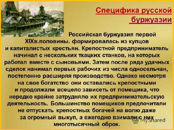 Формирование российской буржуазии также имело свою особенность. Во-первых, капиталы, необходимые для создания производства, накапливались чрезвычайно медленно и со многими злоупотреблениями (казнокрадством, взяточничеством, вымогательством денежных средств у населения). Во-вторых, длительное время "молодая" российская буржуазия одновременно занималась и торговлей, и производством. В-третьих, многие предприниматели были выходцами из разбогатевших крепостных крестьян. Постепенно складывались династии российской буржуазии Сапожниковы, Морозовы, Гучковы, Бибиковы и др. В целом российская буржуазия была еще экономически слабой и не играла активной роли в политической и социальной жизни страны.