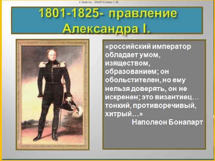 Алекса ндр I Павлович Благословенный (1777— 1825) — император и самодержец Всероссийский (с 12 (24) марта 1801 года), протектор Мальтийского ордена (с 1801 года), великий князь Финляндский (с 1809 года), царь Польский (с 1815 года) старший сын императора Павла I и Марии Фёдоровны 12 марта 1801 г. в результате заговора был убит император Павел I. В план дворцового переворота был посвящен и наследник престола великий князь Александр Павлович. С воцарением нового монарха были связаны надежды на проведение либеральных реформ в России, отказ от деспотических методов правления, свойственных политике императора Павла I.