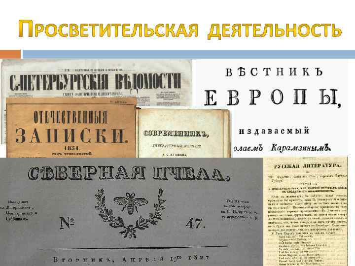Научные общества Географическ ое НО Минералогическо е НО Московское общество испытателе й природы Общество истории и древносте й российски х Общество любителей российской словесност и Особое значение для просвещения народа играло издание книг. В начале XIX в. существовали лишь государственные типографии, в 30— 40 -е годы распространилось частное книгоиздательство. Оно прежде всего связано с именем А. Ф. Смирдина, которому удалось удешевить стоимость книг, увеличить тиражи и сделать книгу широко доступной. Он был не только предпринимателем, но и известным издателемпросветителем.