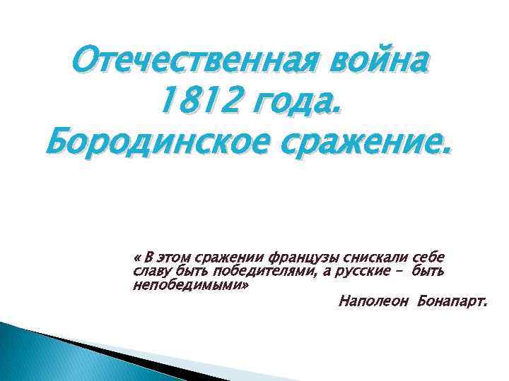 Отечественная война 1812 года. Бородинское сражение. « В этом сражении французы снискали себе славу быть победителями, а русские – быть непобедимыми» Наполеон Бонапарт.