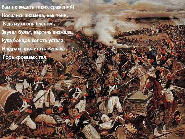Вам не видать таких сражений! Носились знамена, как тени, В дыму огонь блестел. Звучал булат, картечь визжала, Рука бойцов колоть устала, И ядрам пролетать мешала Гора кровавых тел.