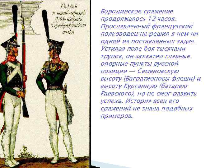 Бородинское сражение продолжалось 12 часов. Прославленный французский полководец не решил в нем ни одной из поставленных задач. Устилая поле боя тысячами трупов, он захватил главные опорные пункты русской позиции — Семеновскую высоту (Багратионовы флеши) и высоту Курганную (батарею Раевского), но не смог развить успеха. История всех его сражений не знала подобных примеров.