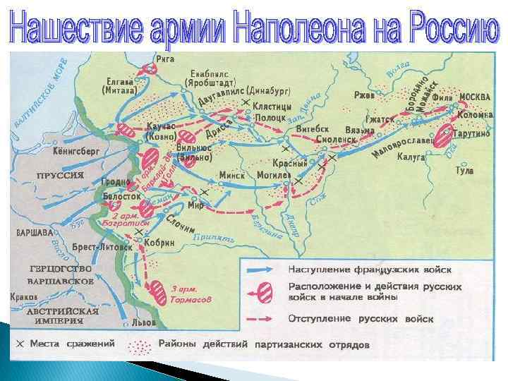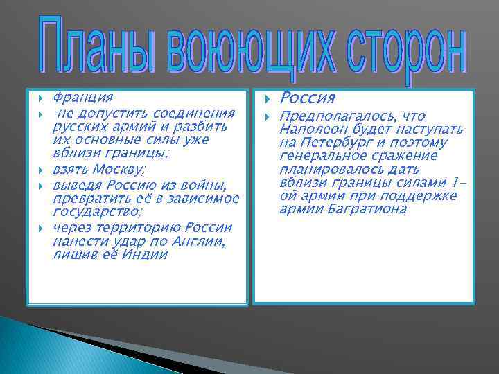 Франция не допустить соединения русских армий и разбить их основные силы уже вблизи границы; взять Москву; выведя Россию из войны, превратить её в зависимое государство; через территорию России нанести удар по Англии, лишив её Индии Россия Предполагалось, что Наполеон будет наступать на Петербург и поэтому генеральное сражение планировалось дать вблизи границы силами 1 ой армии при поддержке армии Багратиона
