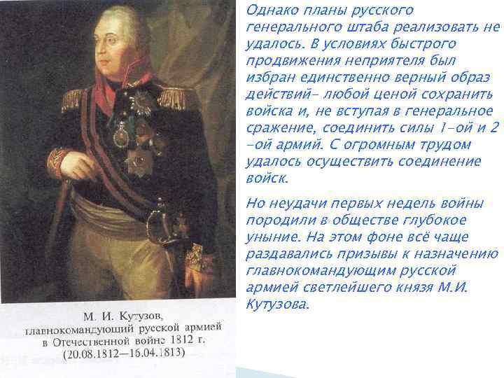 Однако планы русского генерального штаба реализовать не удалось. В условиях быстрого продвижения неприятеля был избран единственно верный образ действий- любой ценой сохранить войска и, не вступая в генеральное сражение, соединить силы 1 -ой и 2 -ой армий. С огромным трудом удалось осуществить соединение войск. Но неудачи первых недель войны породили в обществе глубокое уныние. На этом фоне всё чаще раздавались призывы к назначению главнокомандующим русской армией светлейшего князя М. И. Кутузова.