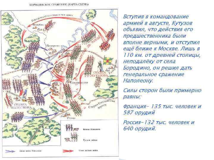 Вступив в командование армией в августе, Кутузов объявил, что действия его предшественника были вполне верными, и отступил ещё ближе к Москве. Лишь в 110 км. от древней столицы, неподалёку от села Бородино, он решил дать генеральное сражение Наполеону. Силы сторон были примерно равны: Франция- 135 тыс. человек и 587 орудий Россия-132 тыс. человек и 640 орудий.