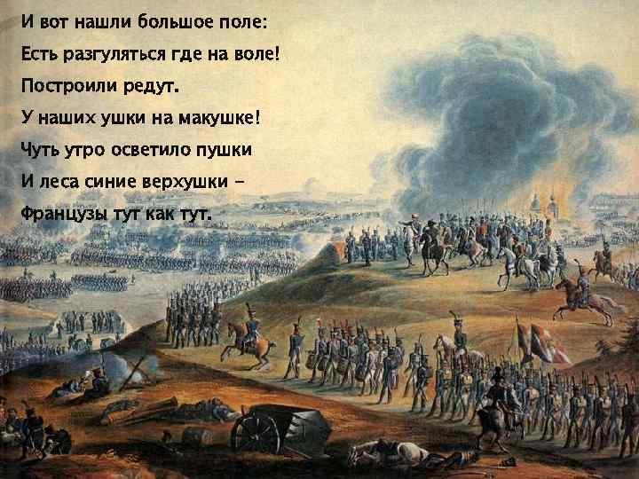 И вот нашли большое поле: Есть разгуляться где на воле! Построили редут. У наших ушки на макушке! Чуть утро осветило пушки И леса синие верхушки Французы тут как тут.