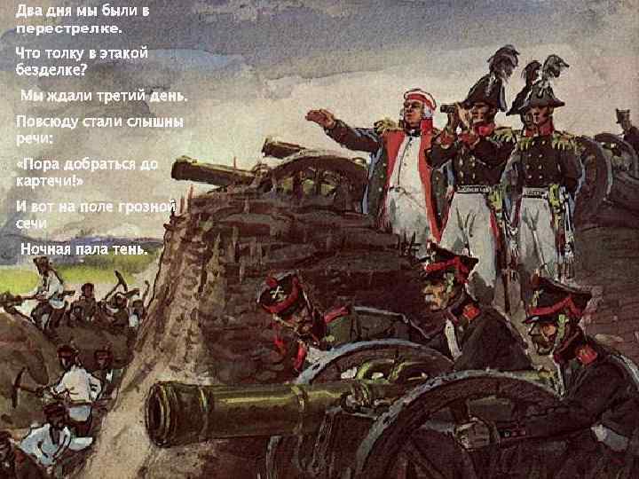 Два дня мы были в перестрелке. Что толку в этакой безделке? Мы ждали третий день. Повсюду стали слышны речи: «Пора добраться до картечи!» И вот на поле грозной сечи Ночная пала тень.