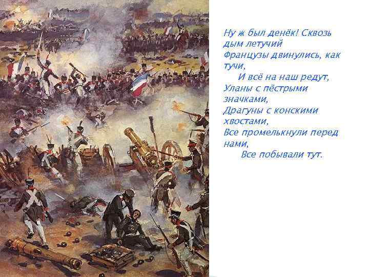Ну ж был денёк! Сквозь дым летучий Французы двинулись, как тучи, И всё на наш редут, Уланы с пёстрыми значками, Драгуны с конскими хвостами, Все промелькнули перед нами, Все побывали тут.