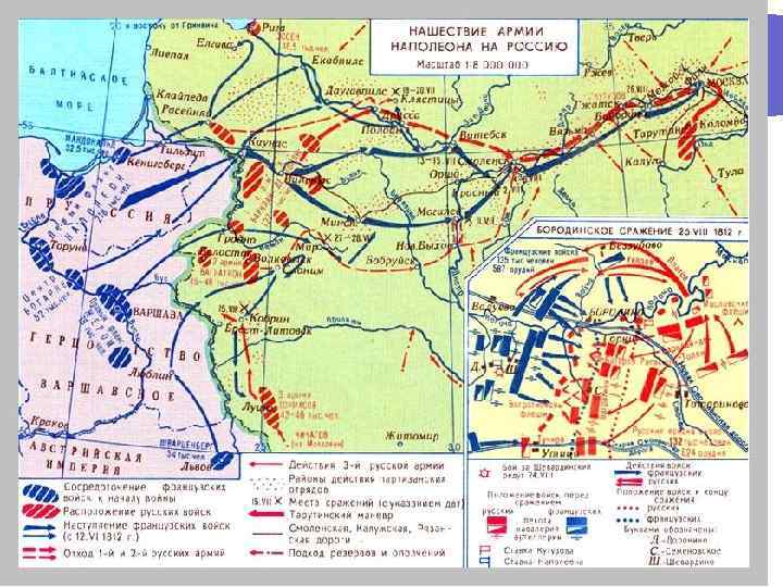 Силы сторон В июне 1812 г. Наполеон во главе 600 -тысячной «Великой армии» начал поход в Россию. l Русская армия, около 200 тысяч человек, была разделена на три части (армии). l Первая армия (М. Б. Барклай де Толли, 110 тысяч), стояла под Вильно и защищала петербургское направление. Вторая армия (П. И. Багратион, 45 тысяч), находилась в районе Белостока и прикрывала дорогу на Москву. Третья армия (А. П. Тормасов, 45 тысяч) дислоцировалась на Волыни и преграждала дорогу на Киев. Такая странная диспозиция русских войск объяснялась отсутствием единого плана ведения войны l