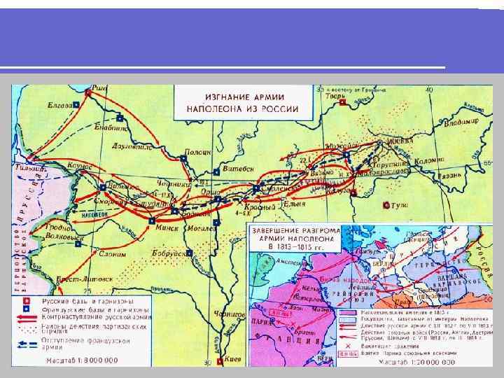 Заграничный поход русской армии Изгнав французов, русская армия в 18131814 гг. приняла активное участие в военных действиях против Наполеона в Европе в союзе с Пруссией, Австрией и Англией. l После целого ряда кровопролитных сражений (крупнейшее – «Битва народов» под Лейпцигом – октябрь 1813 г. ) союзники вторглись во Францию и захватили Париж. Наполеон отрекся от престола и был сослан на остров Эльба l